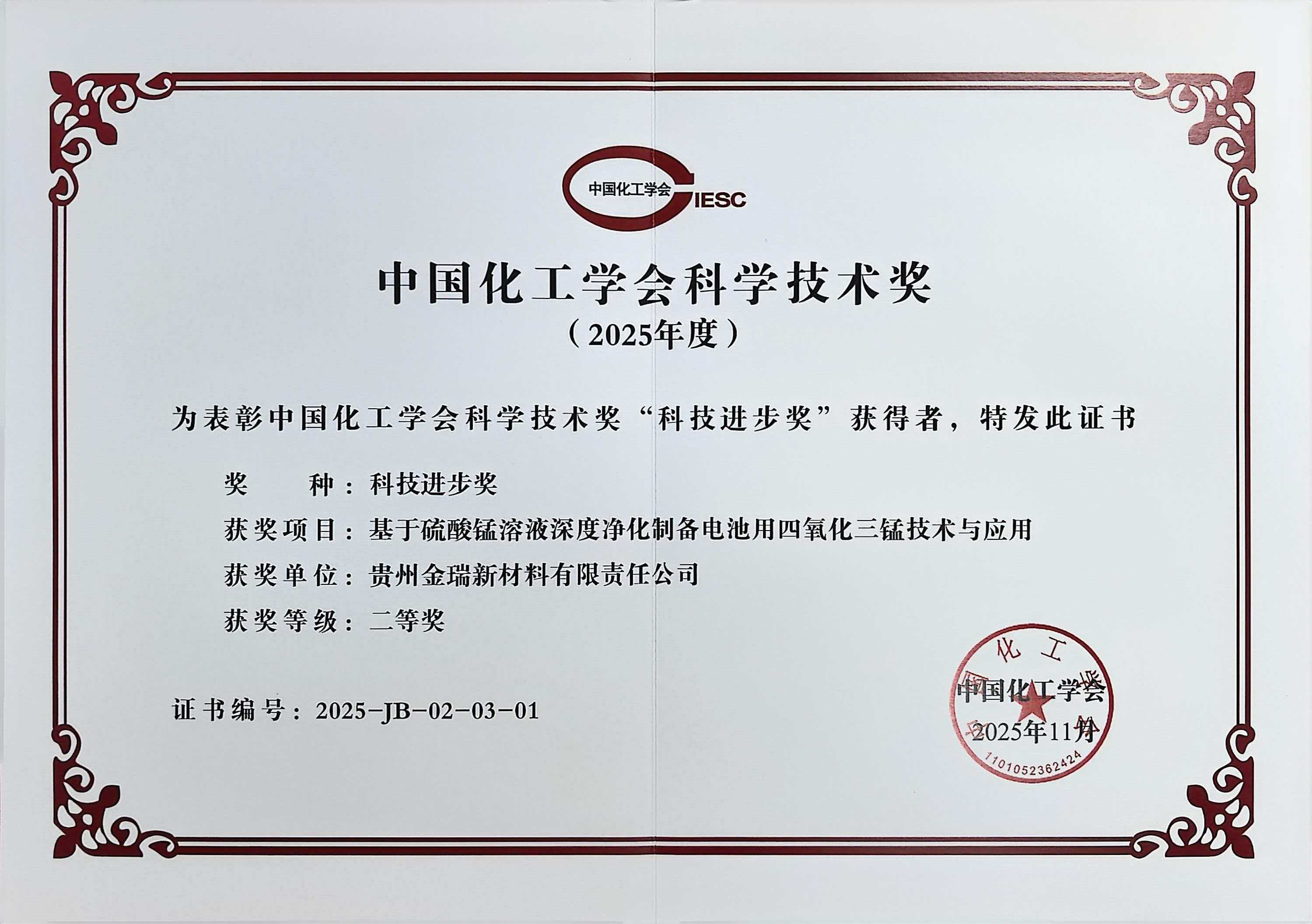 2025年1月,经公司申请,省化学化工学会组织行业专家对该技术开展科学技术成果评价。通过项目汇报、资料审查、质询答疑、专家讨论、出具意见等评价环节,认定该技术在电池用四氧化三锰制备方面具有创新性,达到国内领先水平。2025年6月,该项目获2025年度贵州省化学化工学会科技进步二等奖。同月经贵州省化学化工学会向中国化工学会推荐,获2025年度中国化工学会科技进步二等奖。
